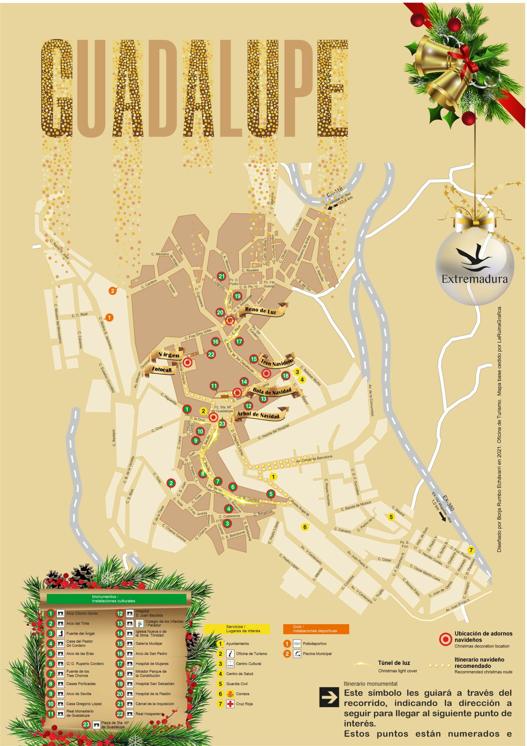 Conoce con este plano los principales puntos de atracción turística de Guadalupe junto con su iluminación navideña tradicional. Este plano navideño corresponde a la iluminación de 2023.